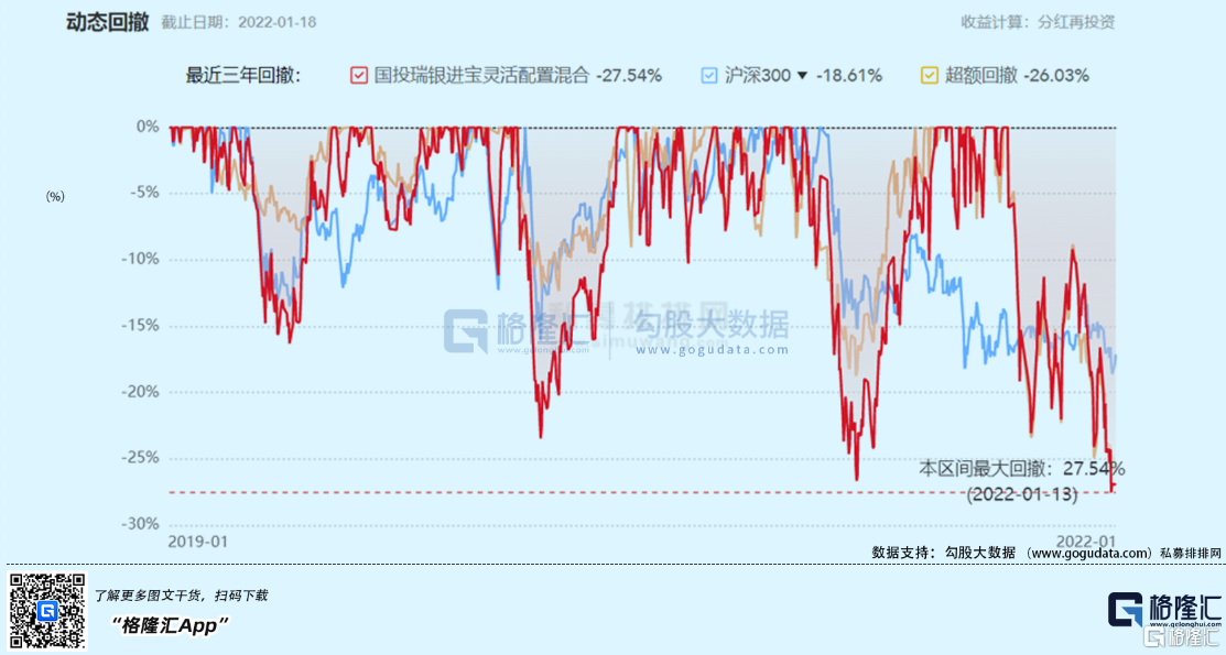 再从回撤的角度来考量,该基金近三年的最大回撤达到了27.54%,高点进场的投资者承担了近三成的亏损。国投瑞银进宝灵活配置混合是属于高风险高收益的一款基金产品,整体的波动较大。