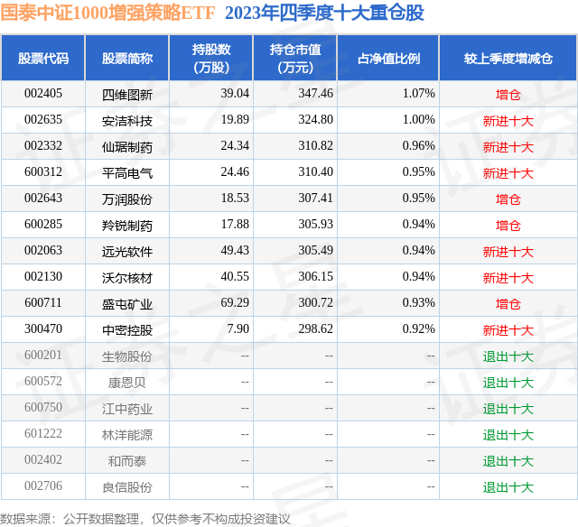 国泰中证1000增强策略ETF的前十大重仓股如下: