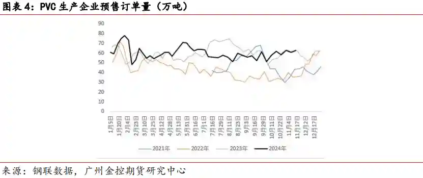 周一PVC期价下行,现货价格跟随走低,下游企业采购积极性有所提高,PVC生产企业预售量环比回升,据钢联数据,截至11月15日,PVC生产企业周度预售订单量为62.92万吨,与上周相比增加1.91万吨,增幅3.13%。近年来下游企业倾向于逢低采购PVC,当市场价格下跌幅度较大时,买家补库的意愿提高。