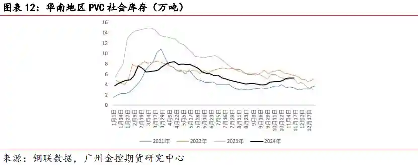 据钢联数据,截至11月15日,国内PVC周度社会库存48.02万吨,环比增加0.5%,同比增加12.35%;其中华东地区库存42.67万吨,环比增加0.45%,同比增加13.21%;华南地区库存5.35万吨,环比增加0.50%,同比增加5.94%。在供增需减的情况下,PVC库存水平已连续两周提高,预计后期将迎来行业季节性累库。