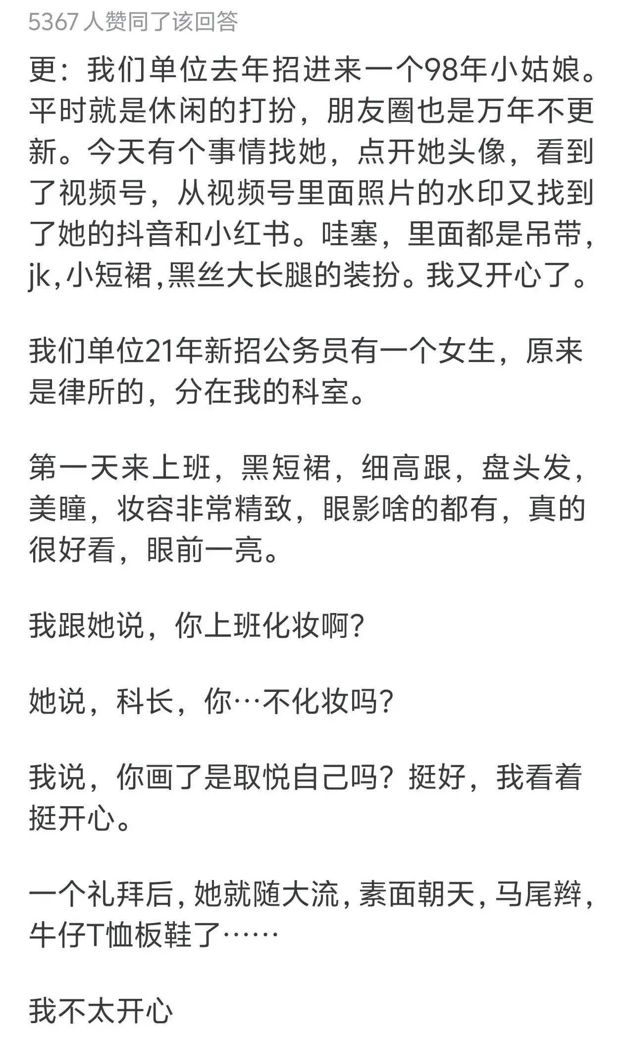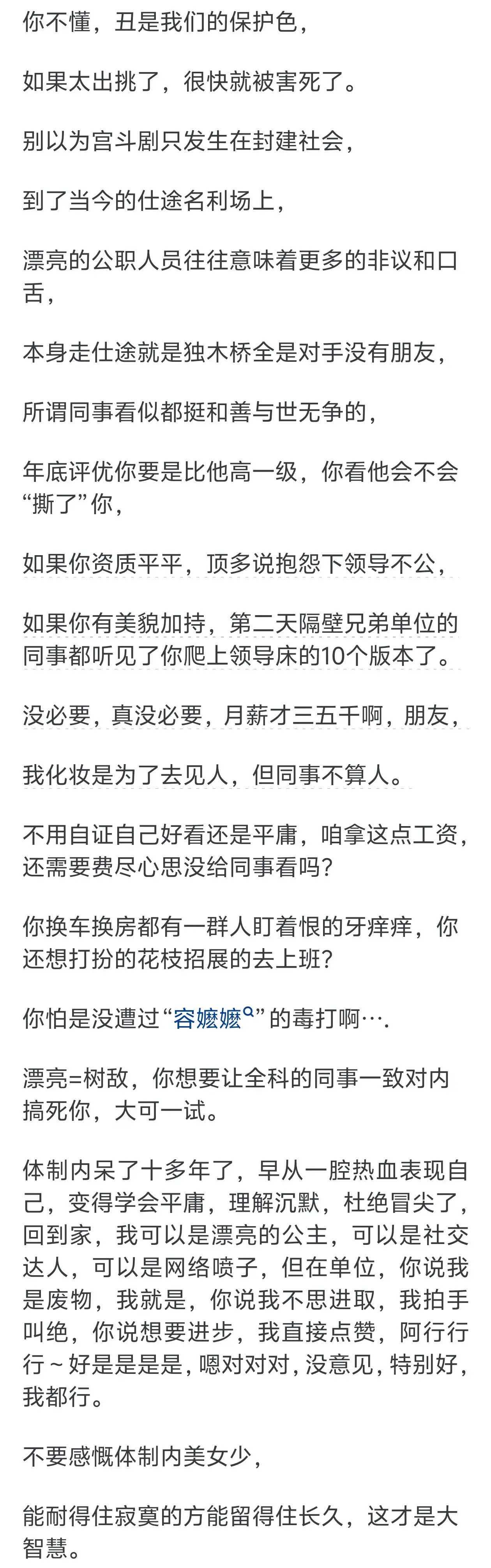 最后,我们不得不提及社会审美观念对女性的影响。如今,美貌被视为一种资本,但女性不应该被过度美化或评判。在公务员这个岗位上,专业素养和能力远比外表更为重要。因此,女公务员更愿意将时间和精力集中在工作上,而不是在妆容上。