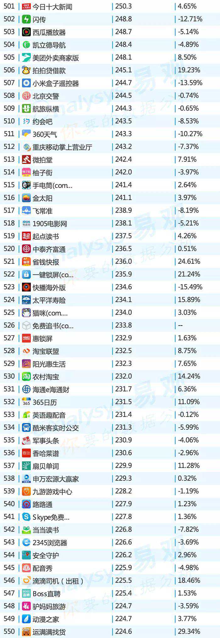 ▌旅游迎传统淡季活跃数普降2017年11月,伴随传统旅游淡季的到来,旅游领域整体均呈现下降态势,TOP1000中旅游一级领域共收录App24个,78%的App显示环比下降态势,其中携程旅行App降幅最大,达-9.68%,本月因为受到国庆期间机票搭售风波和11月幼儿园亲子事件,导致用户投诉率上升以及卸载率上涨,但整体活跃用户规模为4312.49万,依然排名第一。剩余22%的App显示逆势上扬态势,其中航班管家App涨幅最高,达12.76%。