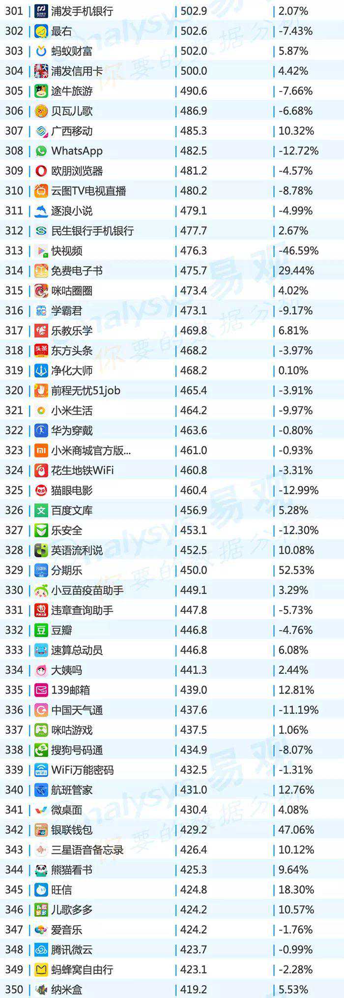 ▌消费季带动各金融支付、银行应用等领域增长在2017年11月银行服务应用App榜单中,中国工商银行、中国建设银行、农行掌上银行分别以4216.31万、4194.69万、2544.09万的活跃用户位列前三甲。