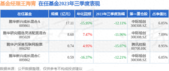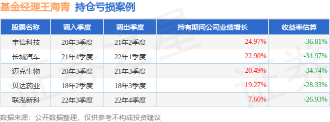 王海青管理的鹏华新兴成长混合A基金在20年3季度买入宇信科技,在持有3个季度后在21年2季度卖出。持有期间的估算收益率为-36.81%,持有期间宇信科技在2020年到2021年的年报营业总收入增幅达24.97%。