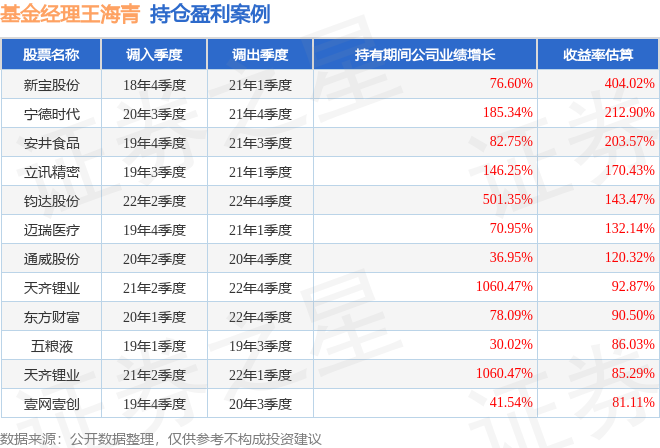 王海青管理的鹏华研究精选灵活配置混合基金在21年2季度买入天齐锂业,在持有1年又2个季度后在22年4季度卖出。持有期间的估算收益率为92.87%,持有期间天齐锂业在2021年到2022年的年报归属净利润增幅达1060.47%。