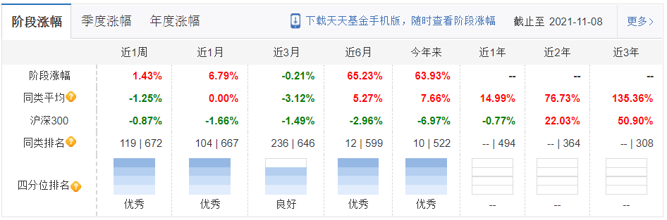 再次,基金于2020-12-30成立至今,截至2021-11-08数据:成立来收益(今年来)66.06%,实质是一枚新能源基金。和之前中欧先进制造一样:中欧先进制造股票,妥妥一枚新能源基金