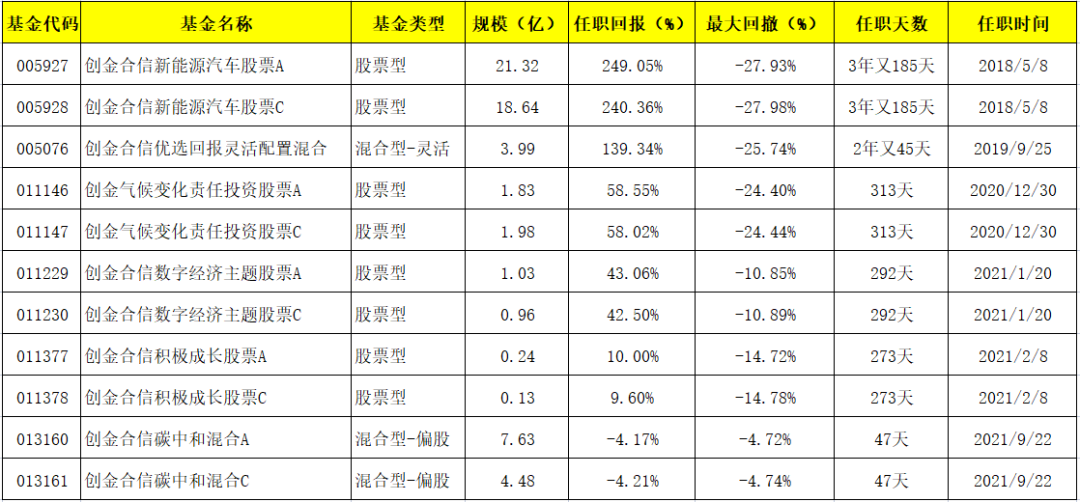 目前管理基金6只,管理最久的是创金合信新能源汽车股票,3年又185天,回报249.05%,最大回撤-27.93%