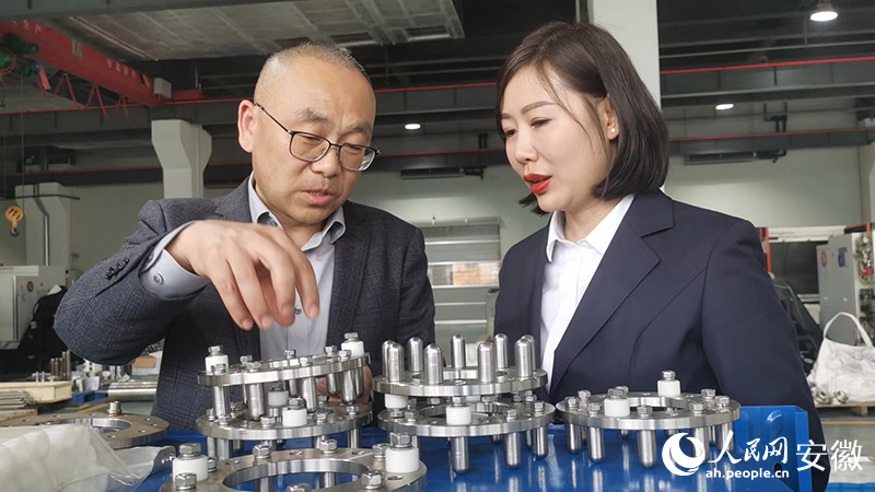 中乐机械负责人(左)向邮储银行工作人员介绍公司产品。人民网胡雨松摄