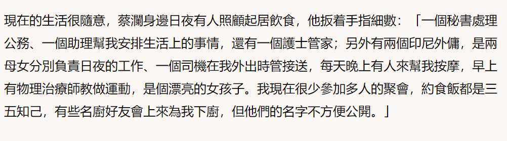为了确保自己的生活过得舒适惬意,蔡澜先生雇佣了一支由8人组成的专业团队。