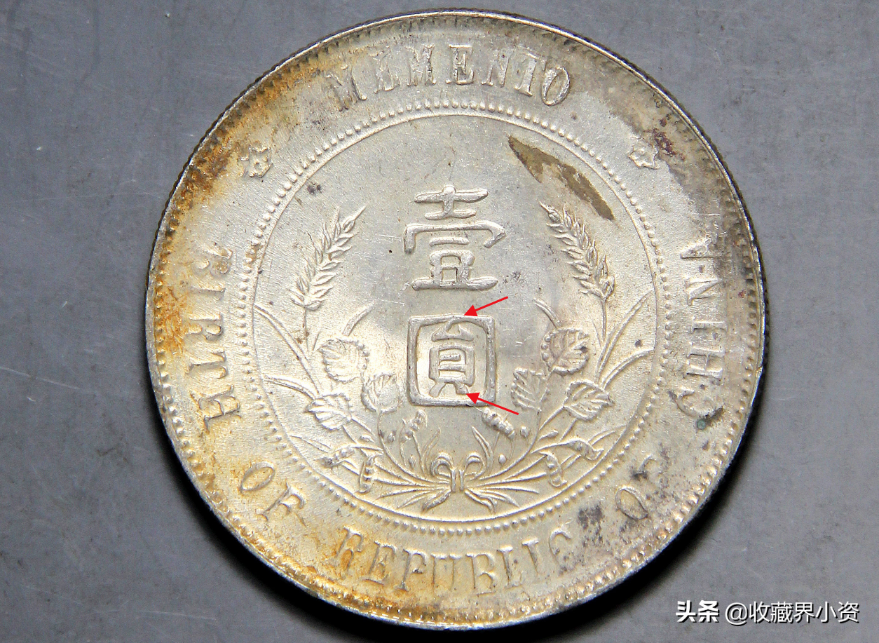特征:左右两边花饰原本是三瓣花枝的位置变成了两个点,这一版一般英文“REPUBLLC”的“R”对应下方的两颗内齿相连或较紧凑,“圆”字为出头圆,所以这一版也称为“点草出头圆”版。(大家注意一下,这一版英文“MEMENTO”中第一个英文字母“E”下面一横有断笔和不断笔之分。)