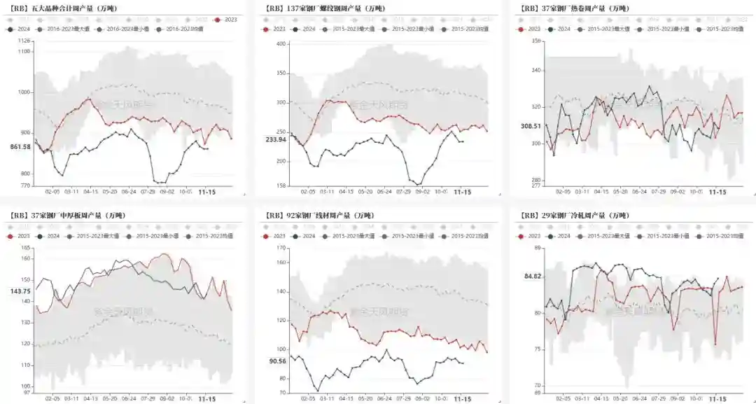 本周,五大品种合计产量为861.58万吨,环比上周回升0.09万吨。