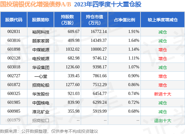 国投瑞银优化增强债券A/B的前十大重仓股如下: