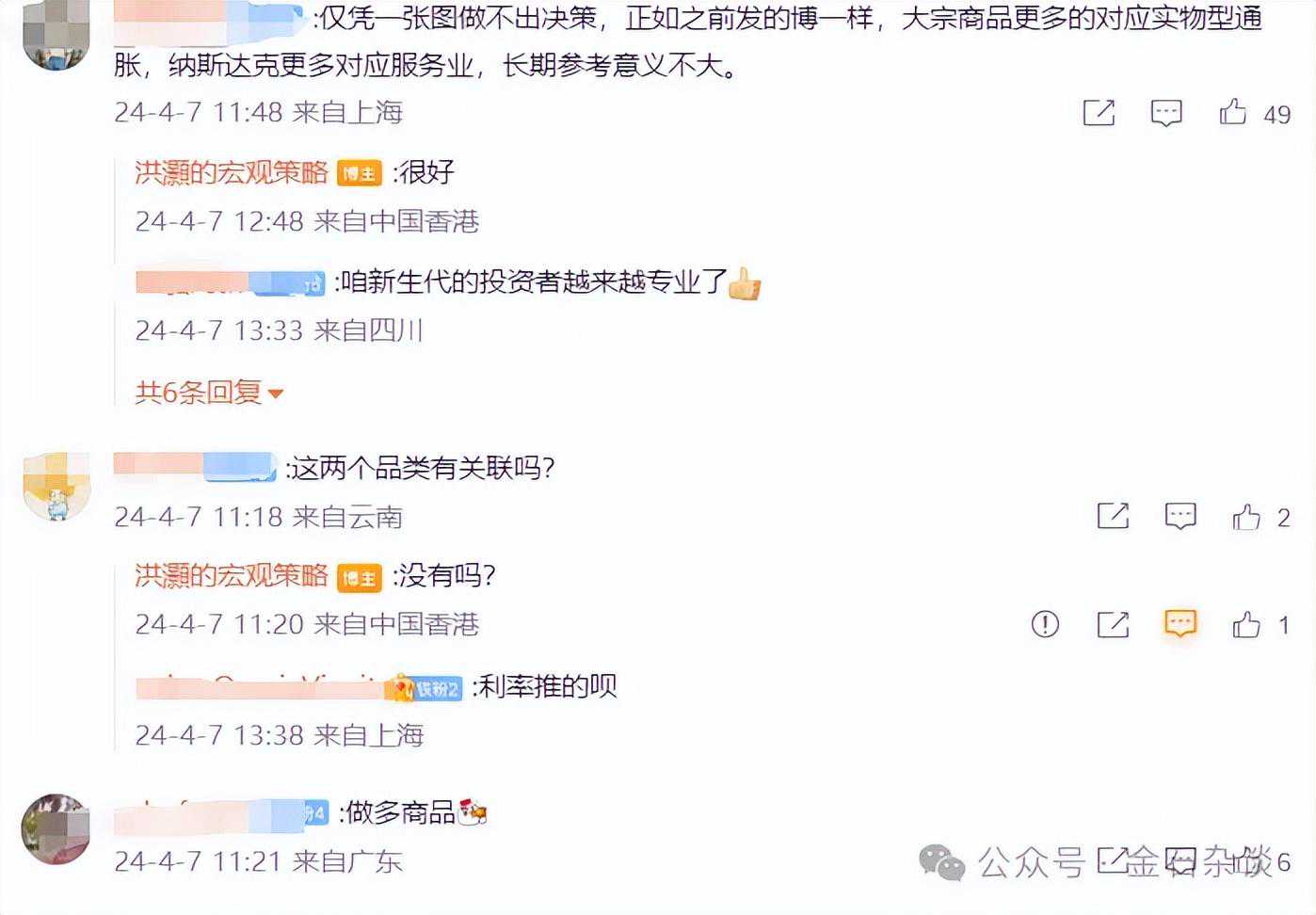 难道又是一次短期看空的标志?有粉丝表示:仅凭一张图做不出决策,正如之前发的博一样,大宗商品更多的对应实物型通胀,纳斯达克更多对应服务业,长期参考意义不大;还有多个粉丝强烈看多大宗;目前的状态就是有人满仓黄金等大宗,有人开始做空。(笔者ps:任何资产你都可以看空,但尽量不要交易层面做空,因为盈利有限,但亏损无限)
