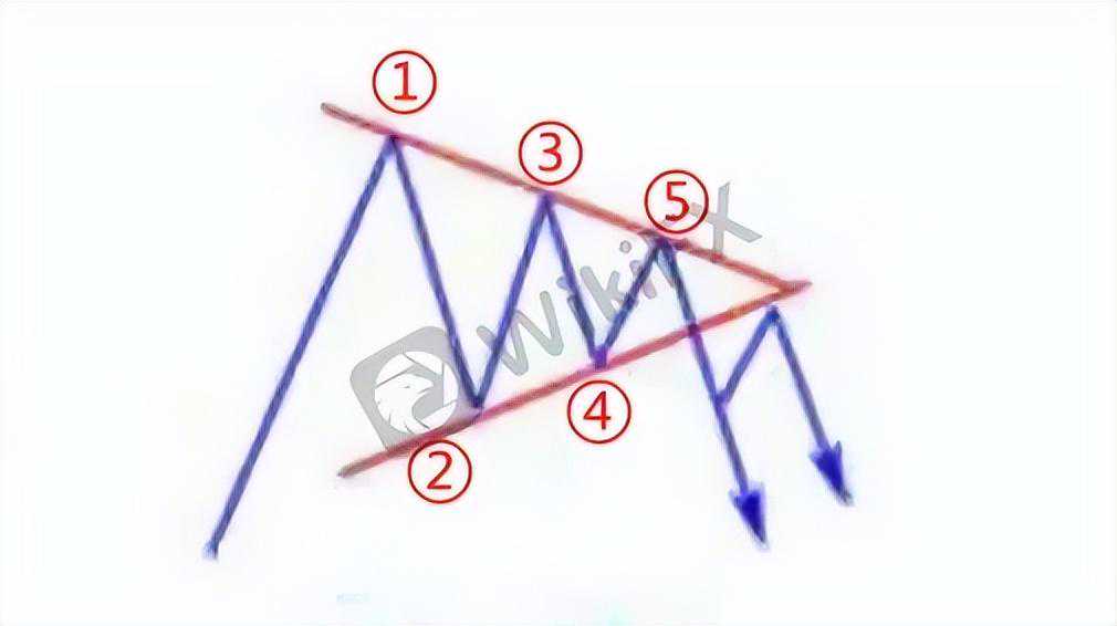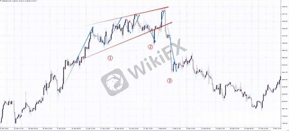 在上升楔形中,下跌的确认同样也是(1)点位密切相关的。如上图,(2)处虽然小幅跌破,但是低点高于(1),说明趋势延续,只有到了(3)处明确跌破了(1)的位置才真正开启跌势。