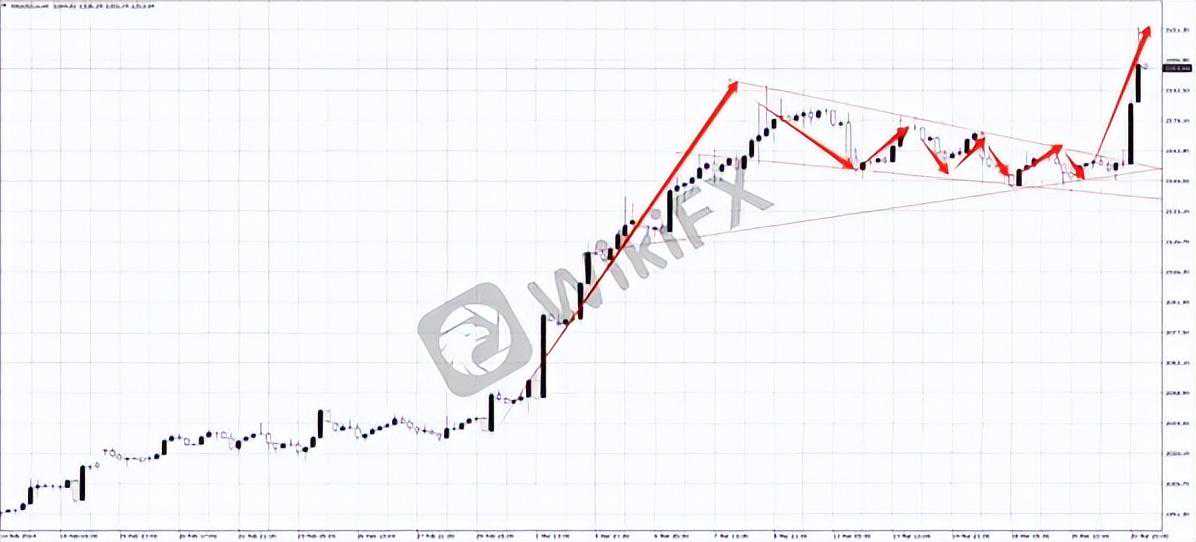 反之,在下降楔形中,随着底部趋于走平,反而带动价格走高。