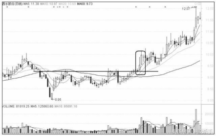 (2)股价对均线系统支撑位(或阻力位)的突破应以收盘价为标准。当股价向上突破均线系统阻力位时,股价应收在阻力位之上,相对应的成交量放大,表明股价向上突破成功,应及时介入(图)。