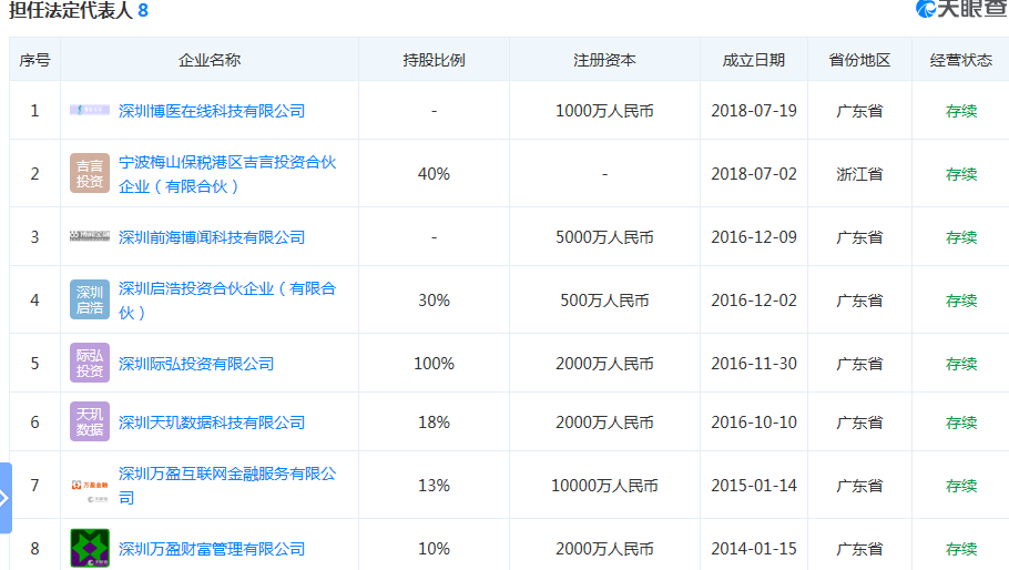 另据天眼查信息显示,万盈金融法定代表人陈杨名下共有25家公司,对其中20家有实际控制权,是8家的法定代表人。