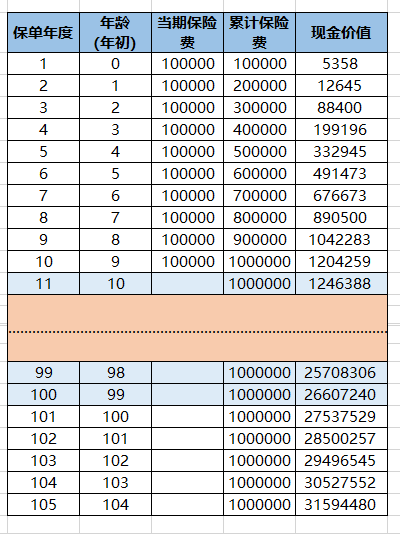 这是某款终身复利3.5的保险产品持续增长的现金价值表: