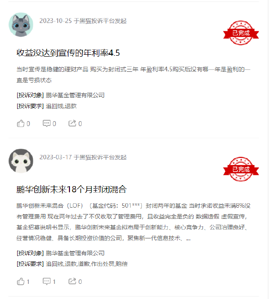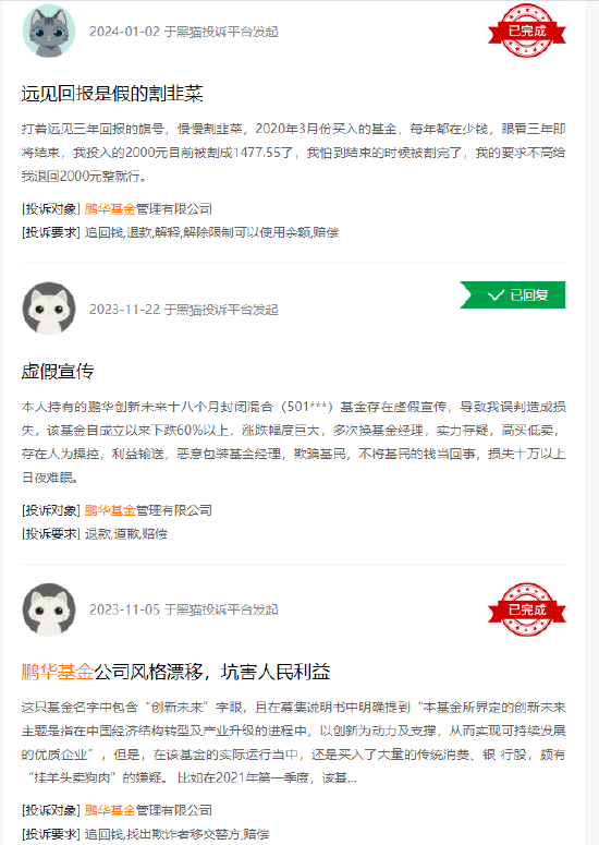 对此,鹏华基金也对相应的投诉用户进行了回复,从黑猫后台数据发现,鹏华基金的回复率达100%,完成率80%。