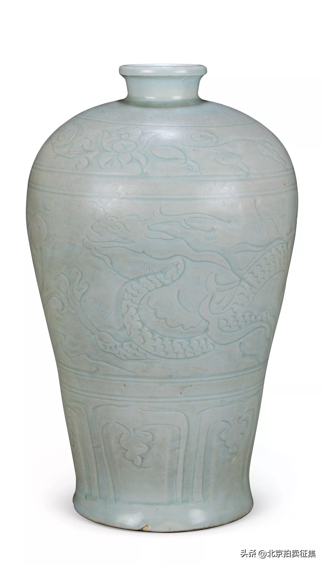 梅瓶大方古朴,修长秀丽,唇口外翻,短颈丰肩,敛腹斜收,至底微微外撇,足底露胎,可见胎骨厚重坚致,火石红、釉斑自然,时代特征鲜明。外壁尽施青白釉,莹润泛青,釉如凝脂,由上及下以剔刻工艺装饰,分以弦纹为界,肩部饰以缠枝花卉纹,腹部主题纹饰为苍龙海水,龙纹矫健威猛,凌空飞腾,海水翻卷,波浪滔滔,富于动感,胫部一周仰莲纹。全器工艺精湛凝练,为一面坡式入刀法,刀法娴熟,线条流畅,寥寥数笔,生动传神,纵观中国古陶瓷中龙纹之演变,元以前失之简略,往往灵动有余,却缺乏威仪,元以后则灵气不足,拘于程序,刻板生硬。唯见元代龙纹威猛精神而不拘一格,灵气与威仪兼备。拍品于清雅干练间保留着蒙元时代的粗犷豪放之美,是为元代梅瓶精美官作,传世少见。