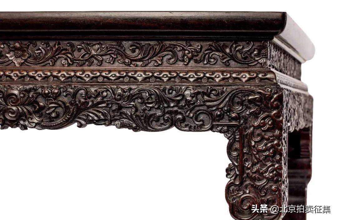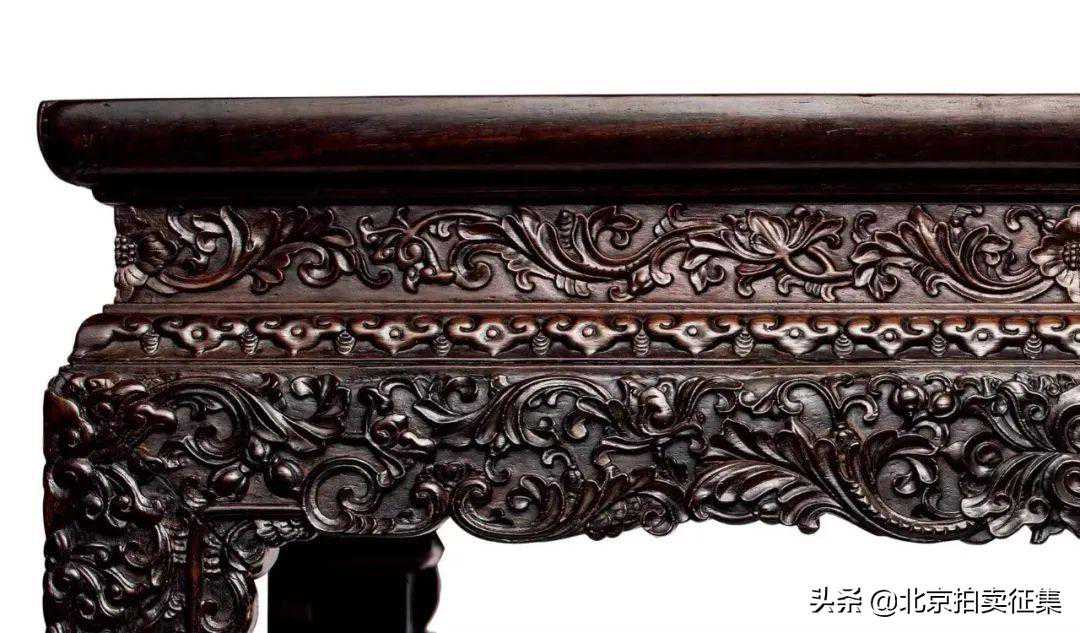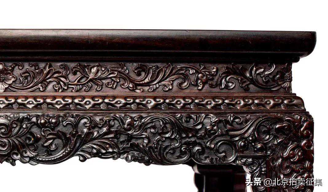 清乾隆时期的家具,尤其是宫廷家具,在用料和工艺上已不惜成本,为达无以附加的境地。当时宫廷木作工匠利用紫檀细密的质地和极高的可塑性,进行精雕细刻制成有雕饰华贵的家具,其中最为典型的为西洋花纹与龙纹二饰。乾隆时期由于法国洛可可式图案的西方贵族情调与清皇室趣味相投,所以当时的紫檀家具也常采用舒卷纠缠的草叶、蚌壳、蔷薇、莲花等西洋图案的雕饰,像此张供桌所示,牙板、和腿足上皆满雕西番莲,巴拿马上则为传统的如意云头,是中西风格互相融合的佳作。