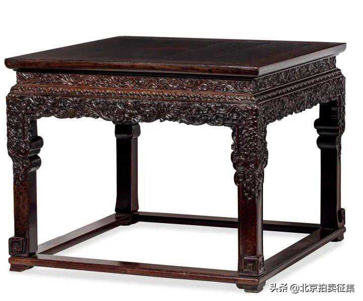 此方凳原为恭王府旧物,有人亦称之为“大方几”或“小供桌”,同样可行。此紫檀西番莲纹有带托泥供桌由紫檀满彻,有束腰、牙板及腿足上端彻满西番莲纹,精雕细琢,富丽精湛。西番莲之筋脉舒卷有力,刀法精绝,叶脉卷转向背,坚致劲挺,状写逼真;牙板枝叶以中间一朵盛放西番莲为核心两侧对称旋曲伸展,牙板边缘随莲就势,自然优美,构图繁而不紊;束腰上西番莲异于牙板图样,适度平面图案化的装饰连续且对称。宝座底座形制典雅,上部精美华伦,下部直腿外翻回纹足,下乘托泥,带有龟脚,简洁与华美相得益彰,使其精工绚丽的风格兼备雅气之风骨。