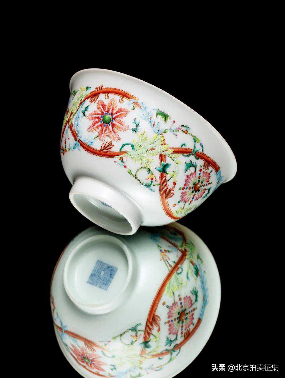 此碗缠枝洋花主要饰以深浅青绿、粉红等西洋色调,并以素洁白地衬托;纹饰内洋花蕊心的圆珠均以白珐琅料点饰光点,充分表现了西洋的明暗立体绘画技法。乾隆洋彩瓷,深获高宗青睐,常多见珍藏于紫禁城内廷乾清宫及圆明园之中。