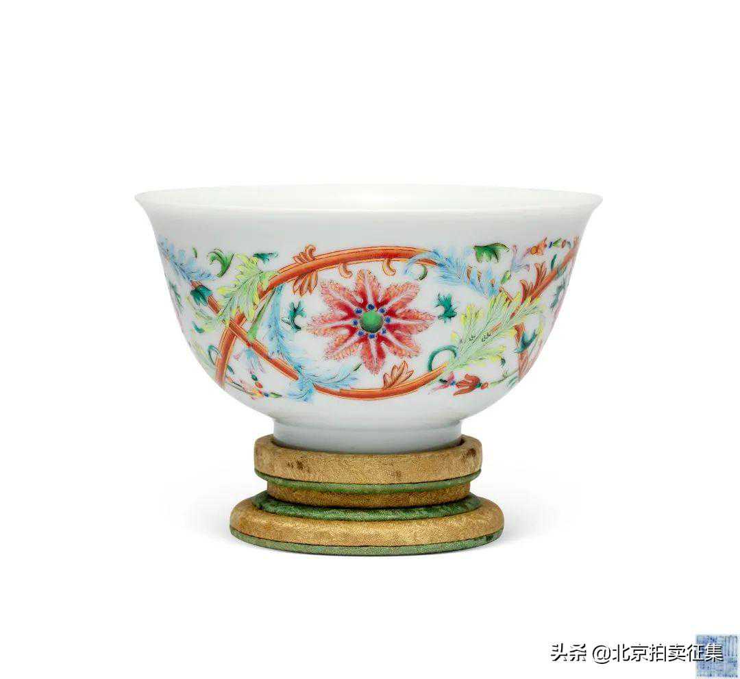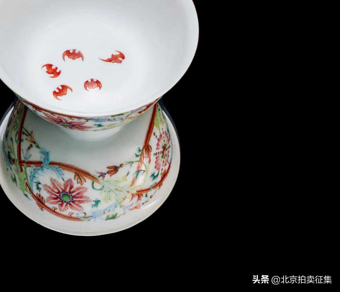 弘历钟爱茗茶,亦好繁缛华丽之品,此盖盅兼属两者之臻,诚为珍器。洋彩花卉纹饰,涣发异国风韵。此类洋彩瓷,取材西洋装饰技法,融入中国传统纹饰,工艺高超,施作精准,成品新颖异趣,然而寥若晨星,极是珍罕。