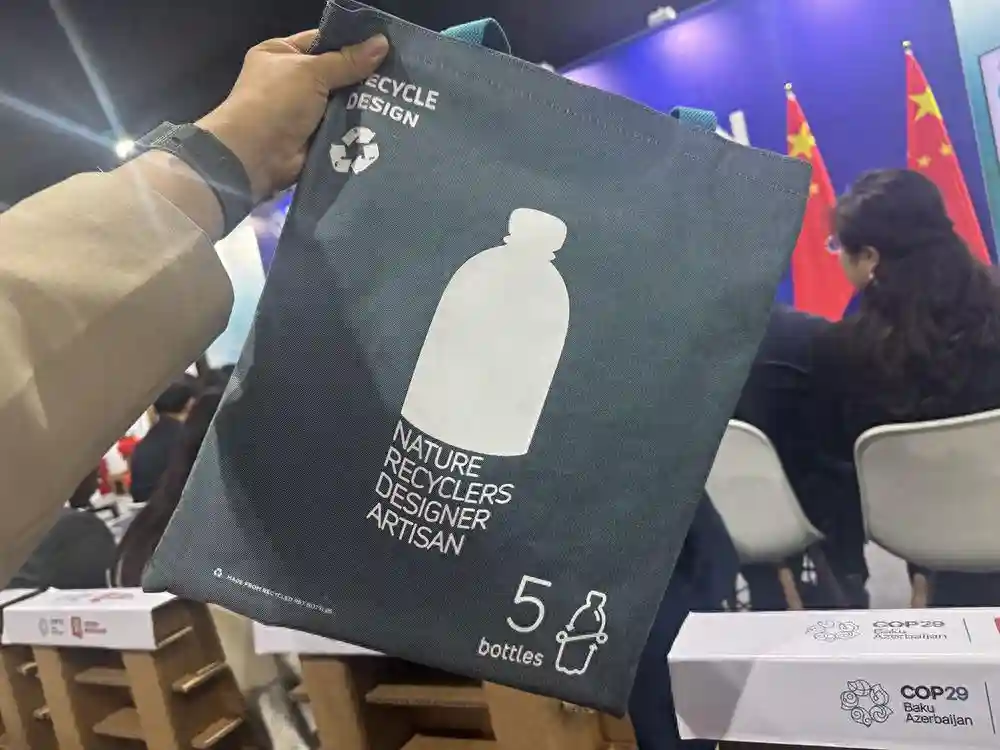 COP29中国角,“节能降碳中国行动”主题边会上发的资料包用5个废旧塑料瓶制作。澎湃新闻记者刁凡超图